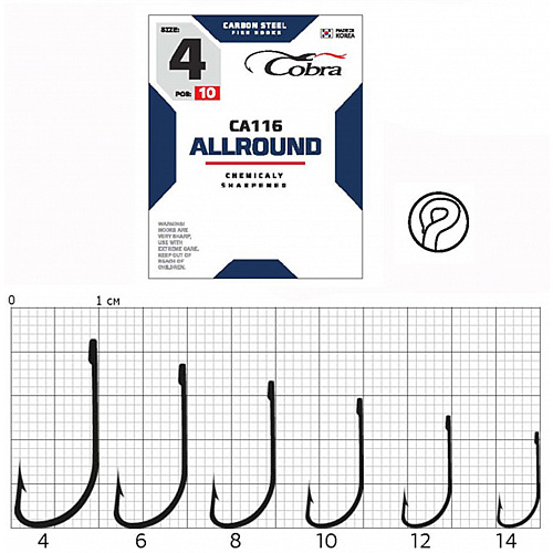 Allround - серия крючков, которая имеет идеальную форму округлого затылка, прямого лба, среднего по размеру цевья и удлиненного жала с бородкой. Эти детали формы делают эти крючки универсальными в использовании. Особо актуально их использование при подборе крючка для ловли на незнакомом водоеме. Ими можно ловить практически на всех водоемах, со всеми типами насадок и по всем видам рыб. Главное правильно подобрать размер крючка под условия ловли и ожидаемую рыбу. Представленный в серии широкий размерный ряд позволит осуществить этот процесс без проблем.
