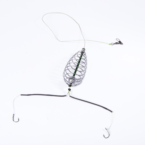 Кормушка с грузом. Используется для разных водоемов. База-плетеный шнур dyneema D-0,28. Поводок-плетеный шнур dyneema D-0,16. Крючок-iseama №8. Термоусадка черная 1б2мм. Кормушка-Спираль.
