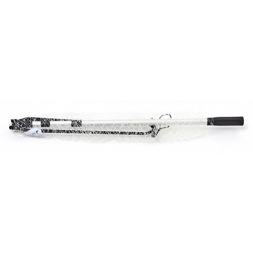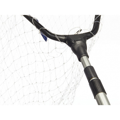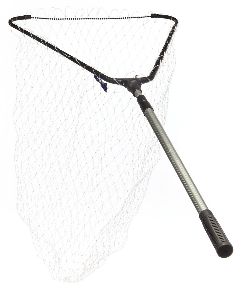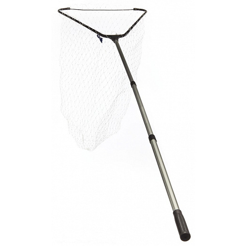 Складной подсачек с треугольной формой сачка с сеткой из лески и с телескопической рукояткой.