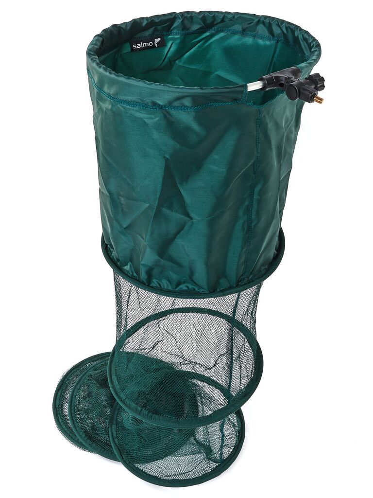 Вместительные матерчатые садки со съемной стойкой для крепления их на берегу. Низ садка оборудован замком с фиксатором, для удобной выемки рыбы.