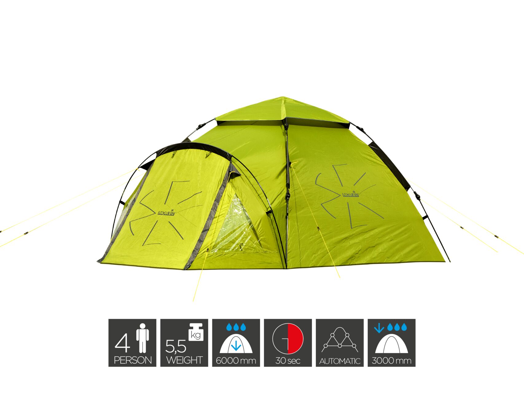 Двухслойная 4-х местная палатка с полуавтоматическим быстро сборным каркасом. Два компактных тамбур на входах в палатку. Внутренняя палатка и тент устанавливаются одновременно. Установка палатки может быть совершена одним человеком за считанные секунды.-два входа