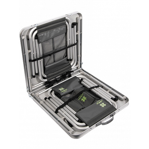 Набор из складного стола и четырех стульев. Стулья складываются иубираются вовнутрь стола, который в собранном виде имеет форму