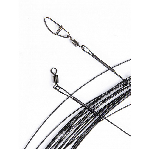 Изготовлен из поводкового материала 7х7 Stainless Steel Wire Leader (США). Данный поводковый материал представляет собой 49 тесно переплетенных стальных проволочек высоколегированной стали, с наружным покрытием из синтетической пленки со специальной пропиткой. Синтетическая пленка продлевает срок службы поводка, препятствуя коррозии. Покрытие поводка дает возможность исключить "вкус метала" для рыбы, такаим образом ставя стальной поводок в один ряд с флюорокарбоновой леской. Кроме того, обмотка петли значительно надежнее в процессе ловли, чем обычно приминяемая обжимная трубка. Эти поводки очень мягки и эластичны. Материал поводков и фурнитура проходят тестирование на разрывные нагрузки. Поводки стойки к деформациям и не теряют своих свойств после длительных нагрузок, испытываемых в поцессе ловли.