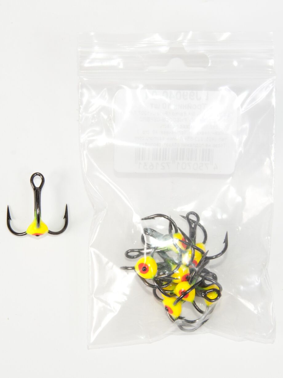 Тройники с пластиковой цветной каплей. Используется для комплектации балансиров и вертикальных блёсен.