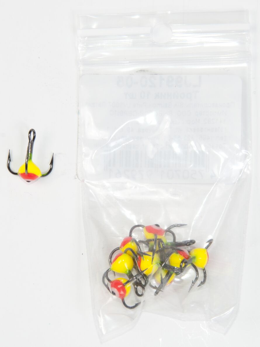 Тройники с пластиковой цветной каплей. Используется для комплектации балансиров и вертикальных блёсен.